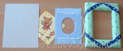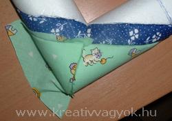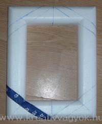 Anyagszükséglet: - 1db hungarocell képkeret 22x29cm-es - kék és zöld aprómintás vászon, valamint 16x23cm világoskék anyag - 35cm farkasfog - 1db kartonpapír kb. 45x30cm-es - 1db mintás szalvéta, vagy fotó - éles, kicsi olló - tapétavágó - selyempapír - 4db gombostű A szükséges eszközök megvásárolhatóak a Kreatív Hobby áruházakban. (www.kreativhobby.hu) Elkészítés: | Rajzoljuk meg a keret mintáját. A képkeret két rövidebbik oldalának húzzuk meg a közepét. E vonalak legfelső és legalsó pontjából indulnak ki azok az egyenesek, amelyek átmennek a keret belső szélének sarkán. Ettől a négy egyenestől húzzunk 2cm-re párhuzamost. | | Azokat a részeket, amit be akarunk fedni anyaggal, rajzoljuk le selyempapírra, majd tegyünk rá 6-7mm varrásszélt. Ahol a részek a keret hátuljával találkoznak 1,5-2cm varrásszél szükséges. | | Vágjuk ki textilbol a darabokat. Nem kell mindet egyszerre, jobb egyenként és azonnal a helyére is illeszteni. Itt kifejezetten elonyös a 45 fokos szálirány, könnyebb dolgozni vele. Ha pontosak akarunk lenni, vagy könnyebbnek érezzük úgy, akkor néhány gombostűvel rögzítsük az anyagot a hungarocellre. Hátul a szélétől 1cm-re vágjuk be a hungarocellt ide is bedolgozzuk majd a textilt. | | A tapétavágóval 0,5-1cm-re vágjuk be a határoló vonalakat, majd nagyjából a textilt a schnitzer hátsó felével nyomkodjuk be a résekbe.A sarkokat hagyjuk a végére. Vágjuk le a túl nagy varrásszéleket, a sarkoknál pedig a többletet. A sarkoknál előfordulhat, hogy be kell csípni a varrásszélt. Mostmár véglegesen nyomjuk bele az anyagot a résbe. A sarkoknál óvatosan lehet használni a tapétavágó hegyét is. | | A kartonból 22x29cm-es és 16x23cm-es téglalapot vágjunk ki. A kisebbik közepére vágjunk akkora oválist, amely megfelel a keretezendő képnek. A világoskék anyagra halványan rajzoljuk rá az oválist, majd ettől 1cm-re vágjuk ki az anyagot. | A berajzolt vonalig cm-ként vágjuk be a varrásszélt. Ragasztózzuk be a kartont az ovális körül, illesszük a kék anyag fonákjára. A varrásszélt hajtsuk a ragasztós részre. A farkasfogat vágjuk ketté, finoman ragasztózzuk be és vízszintesen az oválistól egyenletes távolságra ragasszuk fel. A 22x29cm-es kartonra ragasszuk fel a szalvétát, vagy a fotót. Ragasztózzuk be az imént készített előlap hátulját és pontosan ragasszuk a hátlapra. A maradék kartonból vágjunk ki egy akasztót, amit a hátlapra ragaszthatunk. A hátlapra helyezzük rá a keretet és 4db gombostűvel a sarkokon rögzítsük. | | Amint a ragasztó megszáradt felakaszthatjuk a falra, vagy becsomagolhatjuk kedves ismerősünknek. |