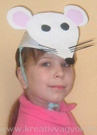 Az egeret hasonló módon készítjük el, csak itt vágni kell vékony csíkokat fekete kartonból. Az arcon megjelölt helyen vágjuk be a papírt és fűzzük bele a csíkokat, ez lesz a bajusz. A fülét plasztikusabbá tehetjük ha belül rózsaszínre festjük.