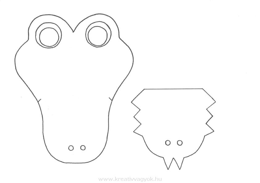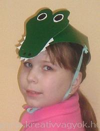 A minta alapján kartonból vágjuk ki a fejfedőt, és a krokodil, "arcát", fehér kartonból a fogait és a szemét, valamint fekete kartonból a szeme közepét. (ez utóbbi lehet fehér kartonból és fessük be feketére)